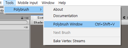 메뉴 상단의 Tools->Polybrush->Polybrush Window을 클릭하여 우측 사진과 같은 Poly brush 에디터를 킨다.