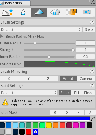 하단에서 색상을 선택하여 유니티 월드상에 메쉬에 버텍스 컬러를 그릴 수 있다.