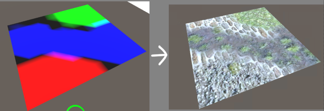 이것으로 터레인에서 텍스처를 그리는 원리도 이전에 버텍스 컬러 기반으로 텍스처 마스킹하는 쉐이더와 비슷한 원리임 을 확인 할 수 있다.