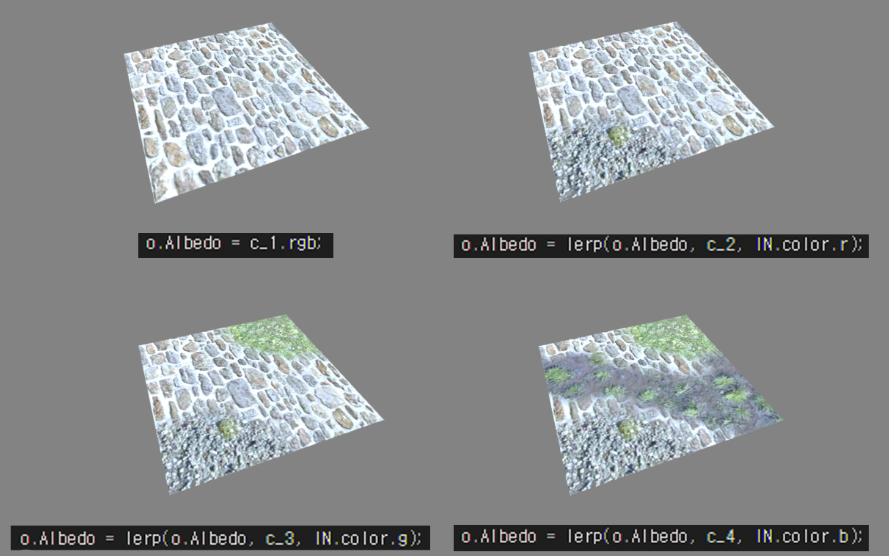 기본 원리는 1번 텍스쳐으로 기본을 깔고 그 위부터 lerp함수에 현재 Albedo값, 합칠텍스쳐, 버텍스 컬러 채널값을 넣어서 완성 시켰다.