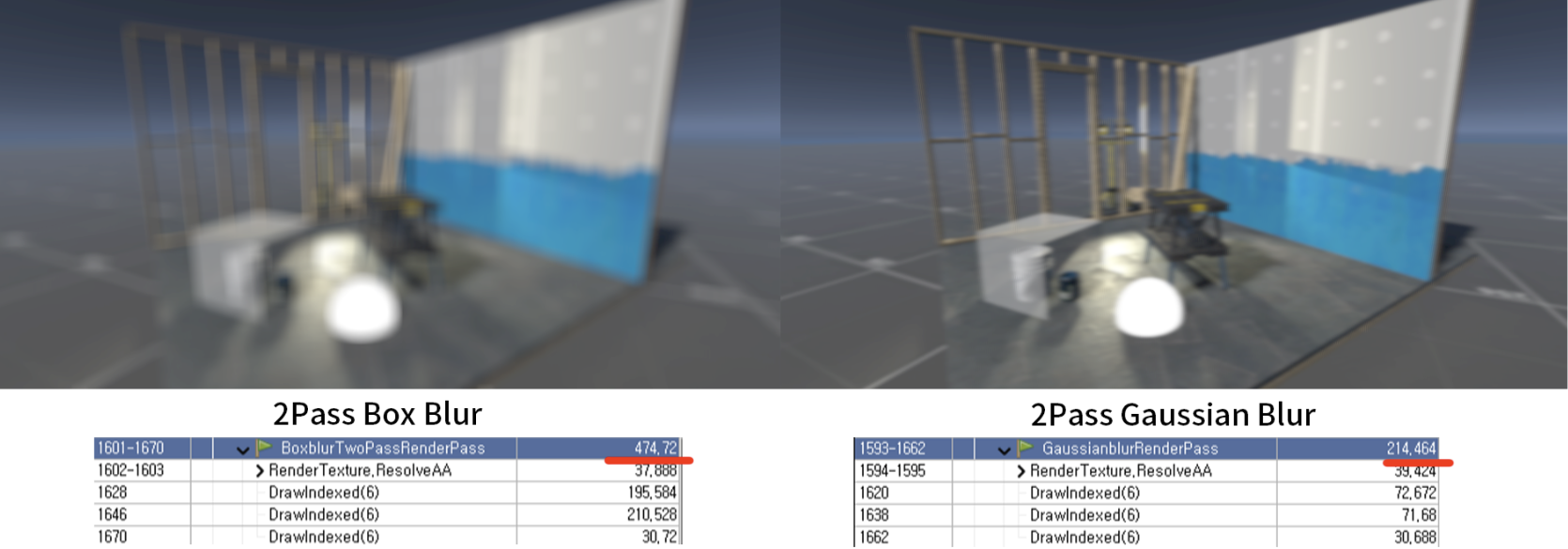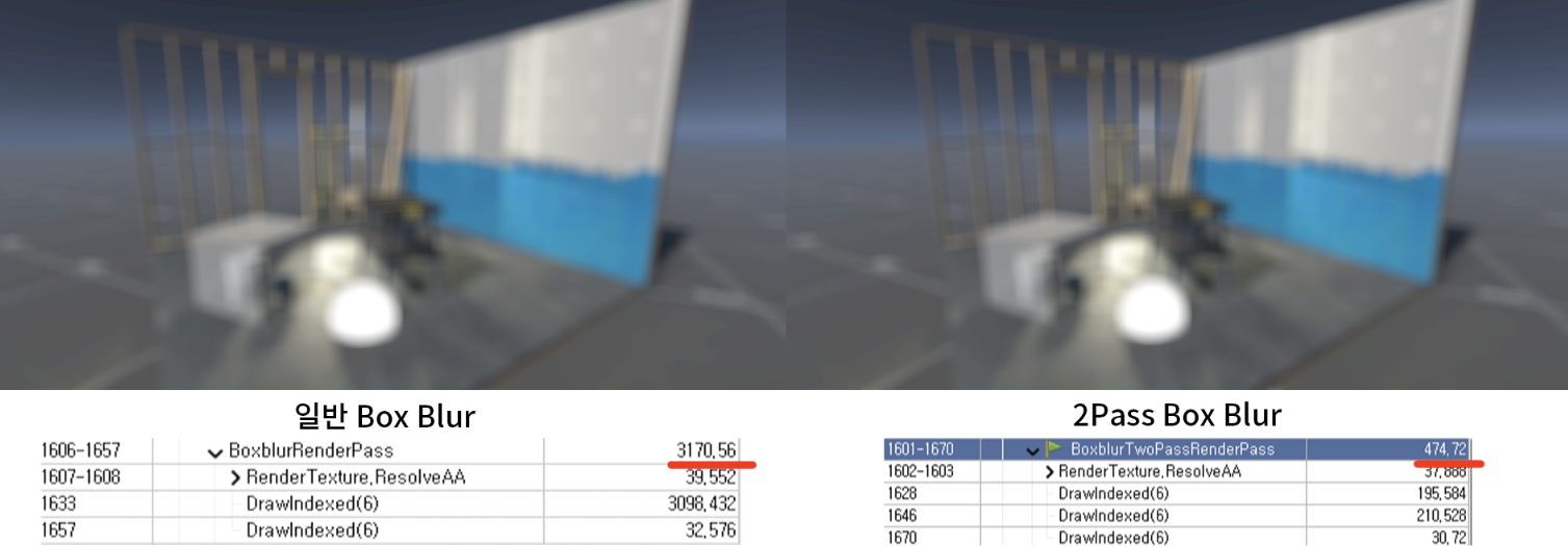 퀄리티는 거의 흡사하고, GPU 프로파일링을 해보니 2Pass방식이 약 6배 가볍게 나왔습니다. (마이크로초 us)