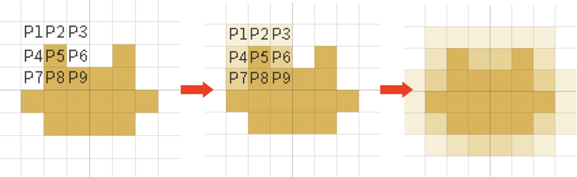위 예시에서는 주변 픽셀 1칸씩만 계산했지만, 2, 3칸 더 넓은 영역을 계산하면 블러 효과가 더 강해집니다.