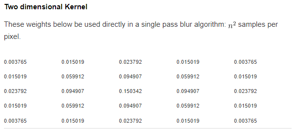 위 사이트에서 가우시안 곡선 값을 계산할 수 있는데, 위 사각형으로 정렬된 값을 픽셀에 계산하는 방식입니다.