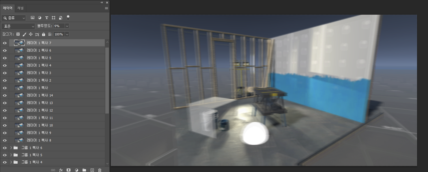 우선 포토샵에서 특정 이미지의 투명도를 낮추고 8방향 조금씩 이동하며 복사하면 블러느낌을 낼 수 있습니다.