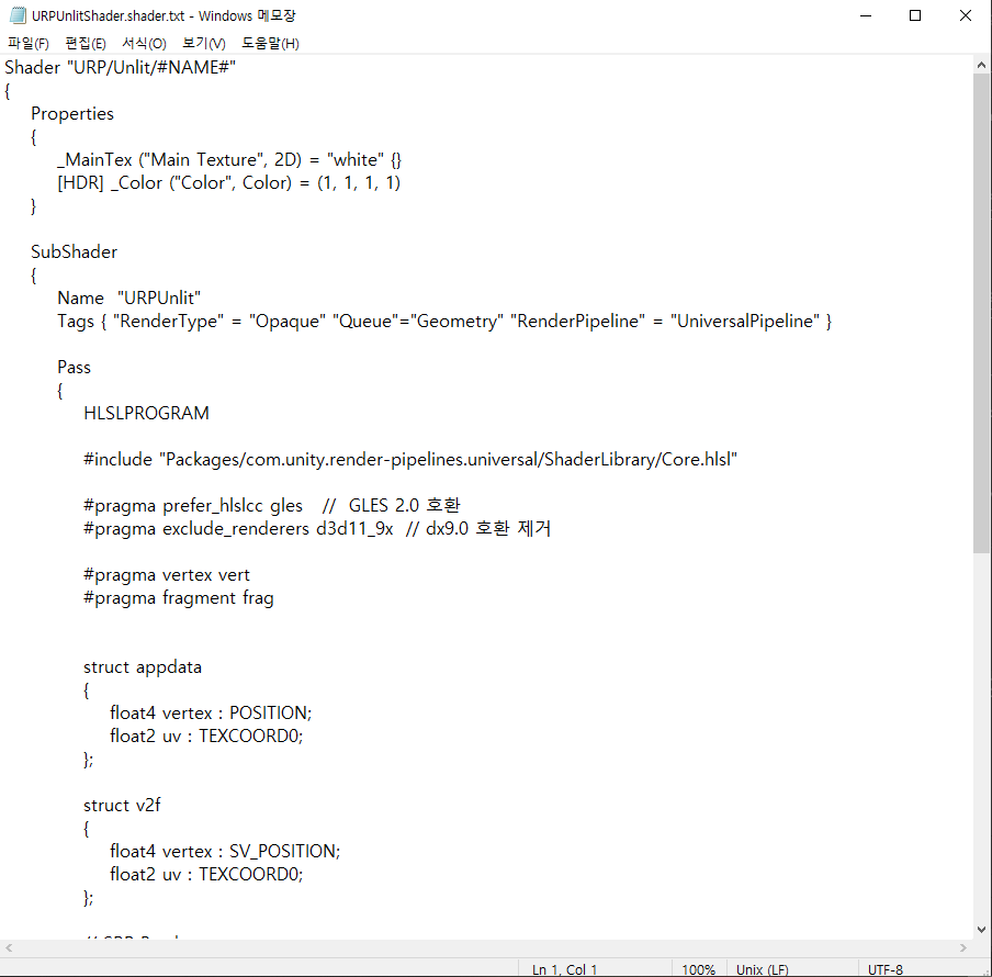 Create->URP Shader->Unlit Shader 메뉴를 클릭하면 HLSL 기반 기본 Unlit쉐이더가 생성됩니다.