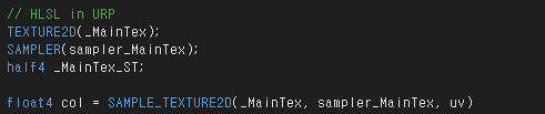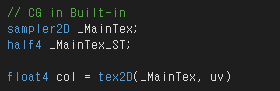 유니티 CG와 HLSL쉐이더에서 각각 텍스처 샘플링하는 코드는 위와 같습니다.