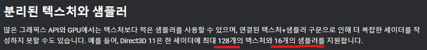 참고로 최신 GPU칩셋에서는 보통 최대 샘플러 16개이지만, GLES2.0같이 구형 칩셋에서는 더 부족합니다.