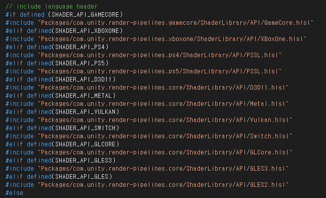 Core RP Library의 Common.hlsl에 분기 처리가 되어 있고, 각 API hlsl파일에 TEXTURE2D 메크로가 선언되어 있습니다.