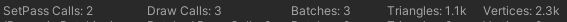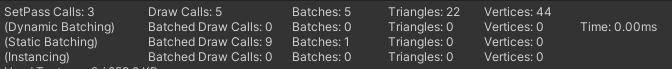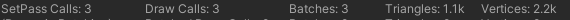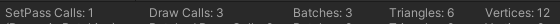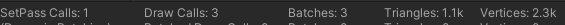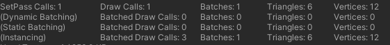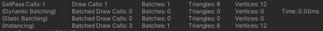 따라서 예시처럼 메쉬 3개, Material 3개로 구성된 화면은 Batches 3 & SetPass Calls 3으로 프로파일링 결과가 나옵니다.