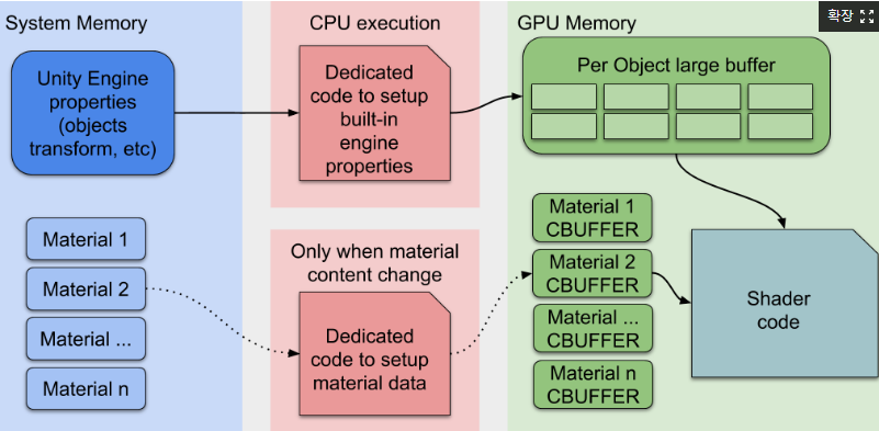 SRP Batcher는 HLSL기반의 쉐이더로 작성되면 동작되고, 기본적으로 Material 값이 다르면 Set Pass Calls이 묶이지 않지만 쉐이더 내부에서 CBuffer에 저장할 변수를 지정하고, 해당 값은 GPU에서 처리되기 때문에 Set Pass Calls이 발생하지 않아 SRP Batcher에 묶일 수 있게 됩니다.