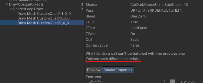 하지만 Frame Debugger에서는 3 draw calls가 1개로 묶였다고 표시되고 있습니다.
