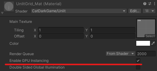 #pragma multi_compile_instancing 코드를 작성하면 아래와 같이 Material에 GPU Instancing 활성화 메뉴가 나오고 체크해야 작동합니다.