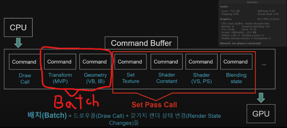 GPU가 오브젝트를 화면에 그리는데 시간이 필요한데, 한 프레임에 그려야할 횟수가 많으면 게임 FPS가 낮아지고 모바일 기기에서는 GPU 부하로 인해 발열 이슈가 생깁니다.