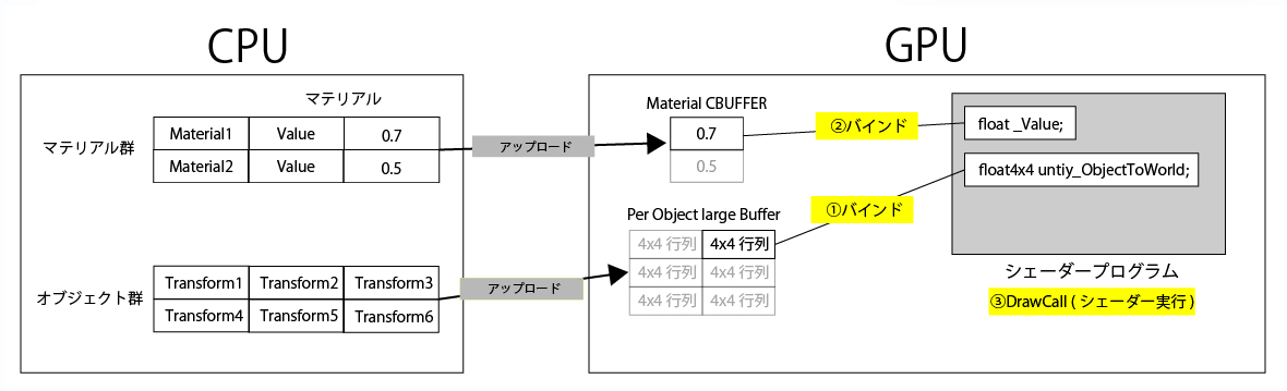 그래서 Per Object large buffer에 저장된 메쉬 정보와 CBuffer에 저장된 Material 정보가 일치하면 한번에 묶어서 드로우콜하는 원리로 추측됩니다.