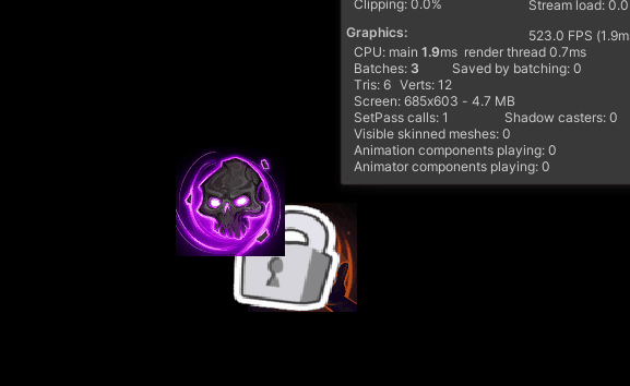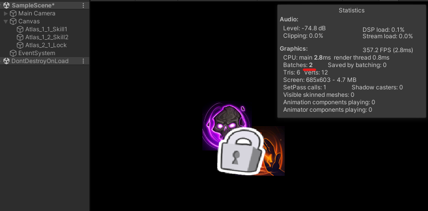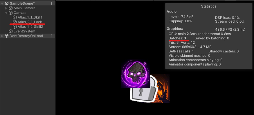 2가지 아틀라스 이미지가 렌더 순서가 묶이게 되면 배칭이 동작하지만, 중간에 다른 아틀라스 이미지가 끼어들면 배칭이 깨지게 됩니다.