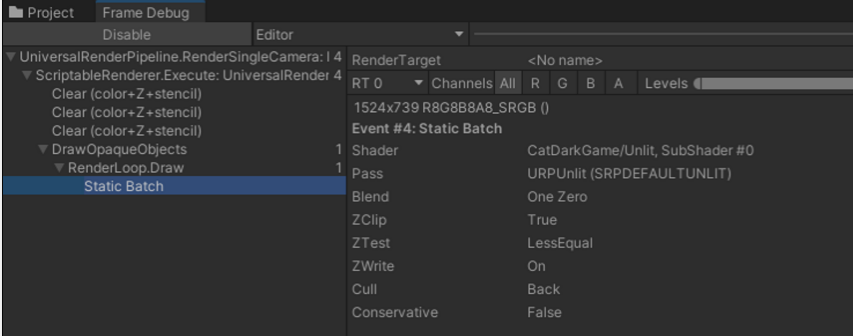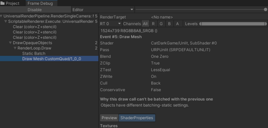 위 상황에서 Static Batching이 깨지게 되고, Frame Debugger에 위와 같은 경고 메세지를 확인할 수 있습니다.