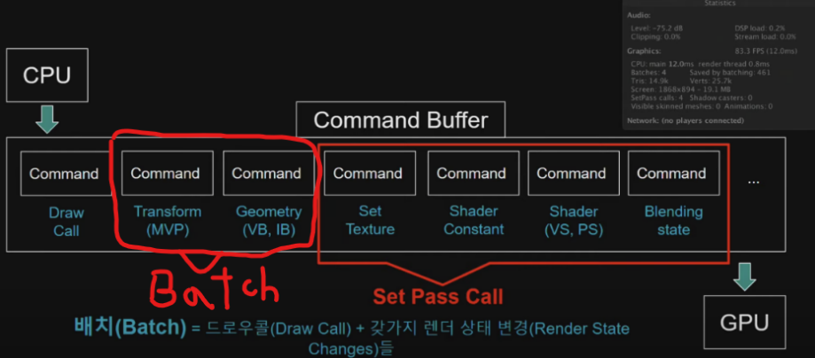 Draw Call(드로우콜)이란? GPU에게 오브젝트를 화면에 그리라고 명령하는 것 입니다. 드로우콜을 줄여야(최적화)해야하는 이유? GPU가 오브젝트를 화면에 그리는데 시간이 필요한데, 한 프레임에 그