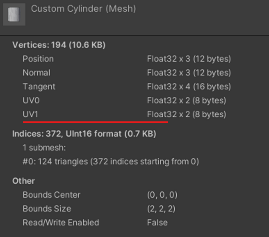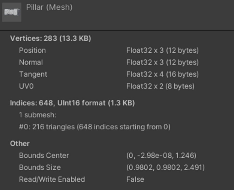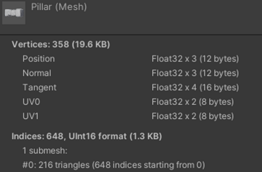 그래서 기둥 메쉬에도 UV1 채널을 추가하면 Static Batching이 잘 동작하여 이슈가 해결됩니다.