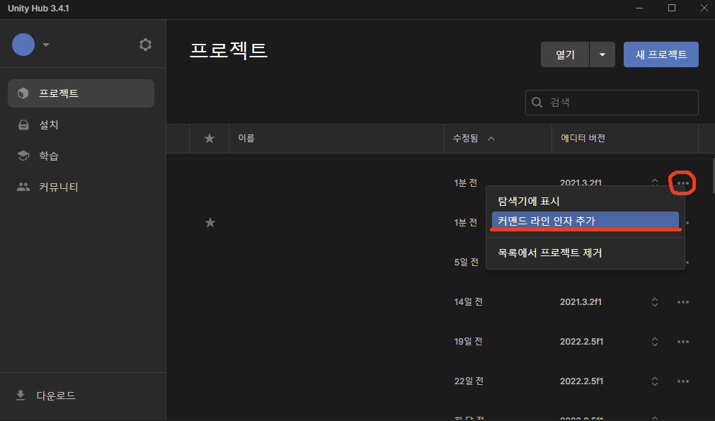 1. Unity Hub에서 원하는 프로젝트의 "..." -> "커맨드 라인 인자 추가" 클릭
