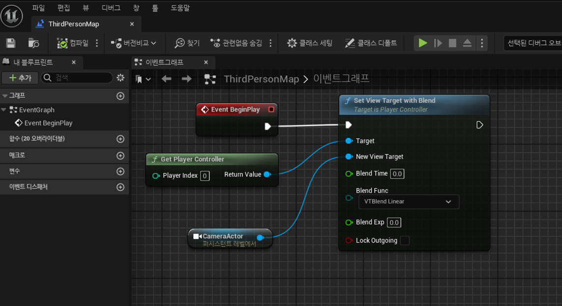BeginPlay(게임 시작 이벤트)에서 바로 View Target을 설정하는 로직입니다.