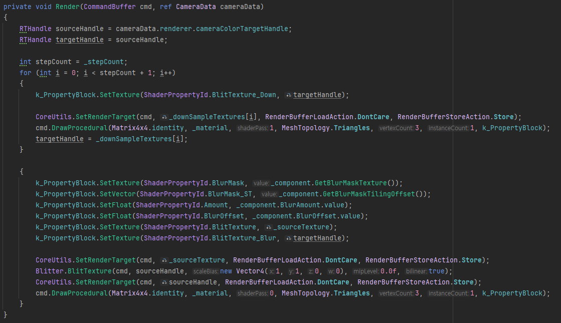 그 외 Material에 값을 직접 세팅하지 않고 MaterialPropertyBlock을 사용했는데, Blitter.BlitTexture 함수를 사용할 때 Material에 직접 값을 세팅해서 사용하면 세팅한 값이 초기화되지 않는 현상이 있어 이와 같이 구현했습니다.