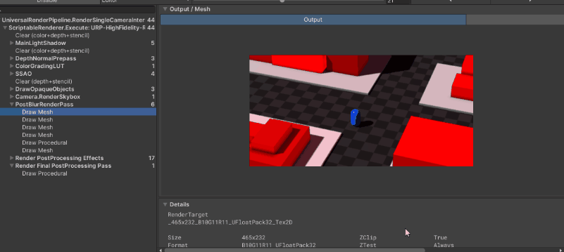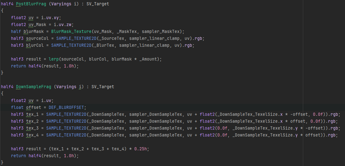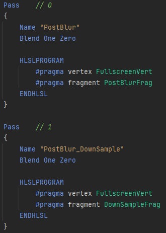 - Pass 0 : 최종 블러 결과물 출력을 담당, 블러 처리된 RT와 Lerp 블랜딩 구현됨.