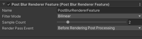 | Blur Offset | 블러 퍼짐 수치를 제어합니다, 원하는 블러 비주얼 방향에 맞게 조절합니다. RendererFeature의 Sample Count와 다르게 런타임에서 유동적으로 값 제어해도 문제 없습니다. |