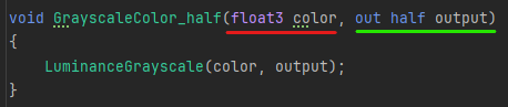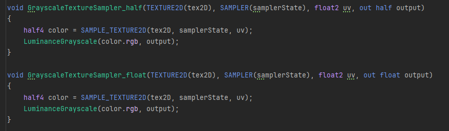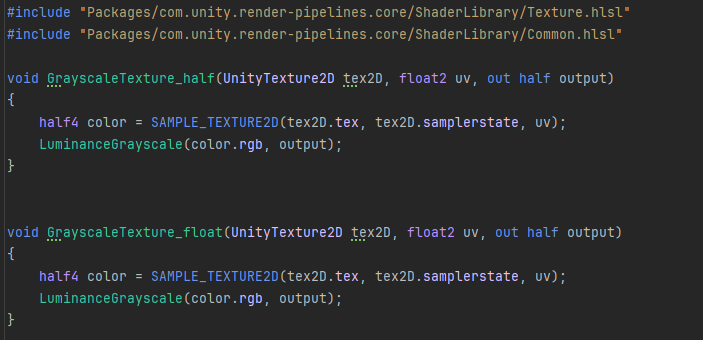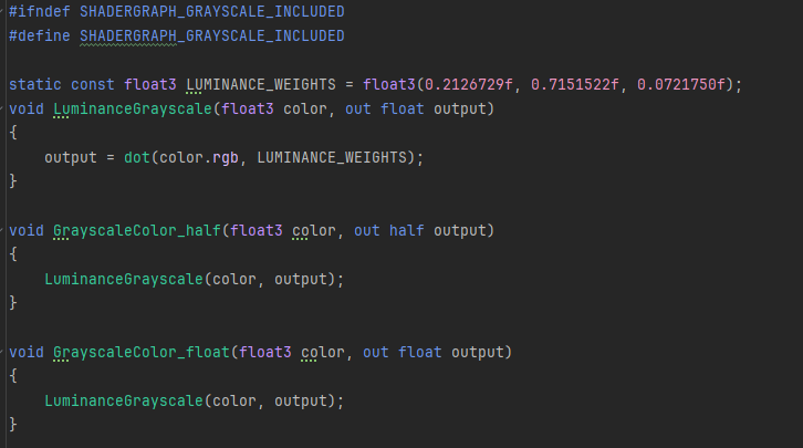 아래는 Grayscale 커스텀 노드 스크립트입니다. 코드 작성 방법은 매우 까다롭기 때문에 자세한 문법은 생략하고 중요 규칙만 설명합니다. 다른 코드 예제는 URP 패키지를 참고하세요.