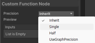 함수 자료형은 Custom Function Node의 Precision(정밀도) 메뉴와 연동되는 부분이며 Single로 세팅하는 경우 "함수이름_float" 함수가 호출되는 방식입니다.