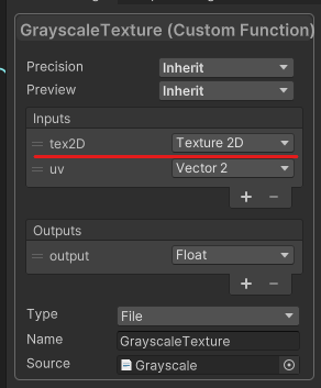 일반적으로 텍스처 파라미터는 Texture2D & TEXTURE2D 자료형을 사용하지만, 위 코드에서는 UnityTexture2D 자료형을 사용합니다. UnityTexture2D 자료형은 Custom Function 노드 파라미터 항목의 Texture2D와 연동되는 구조체 변수입니다.