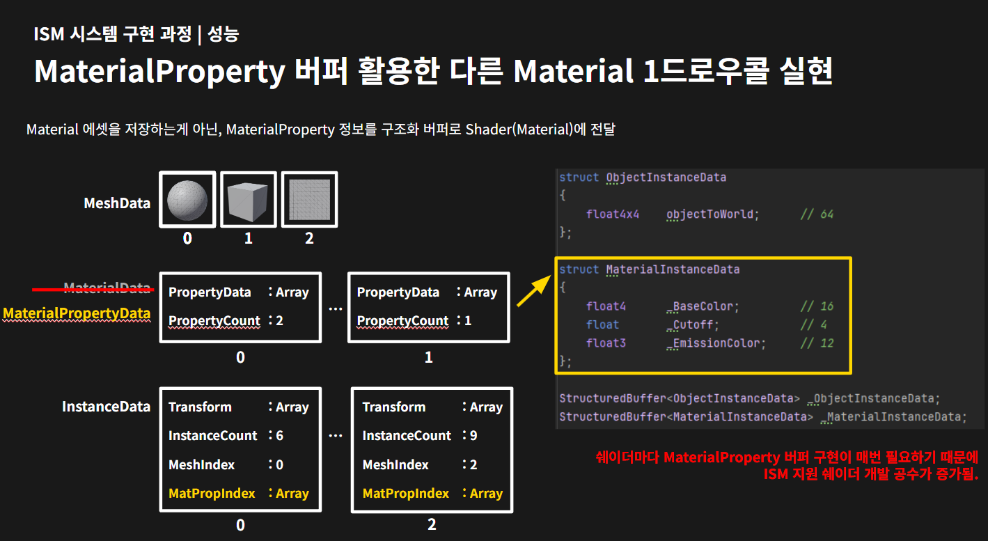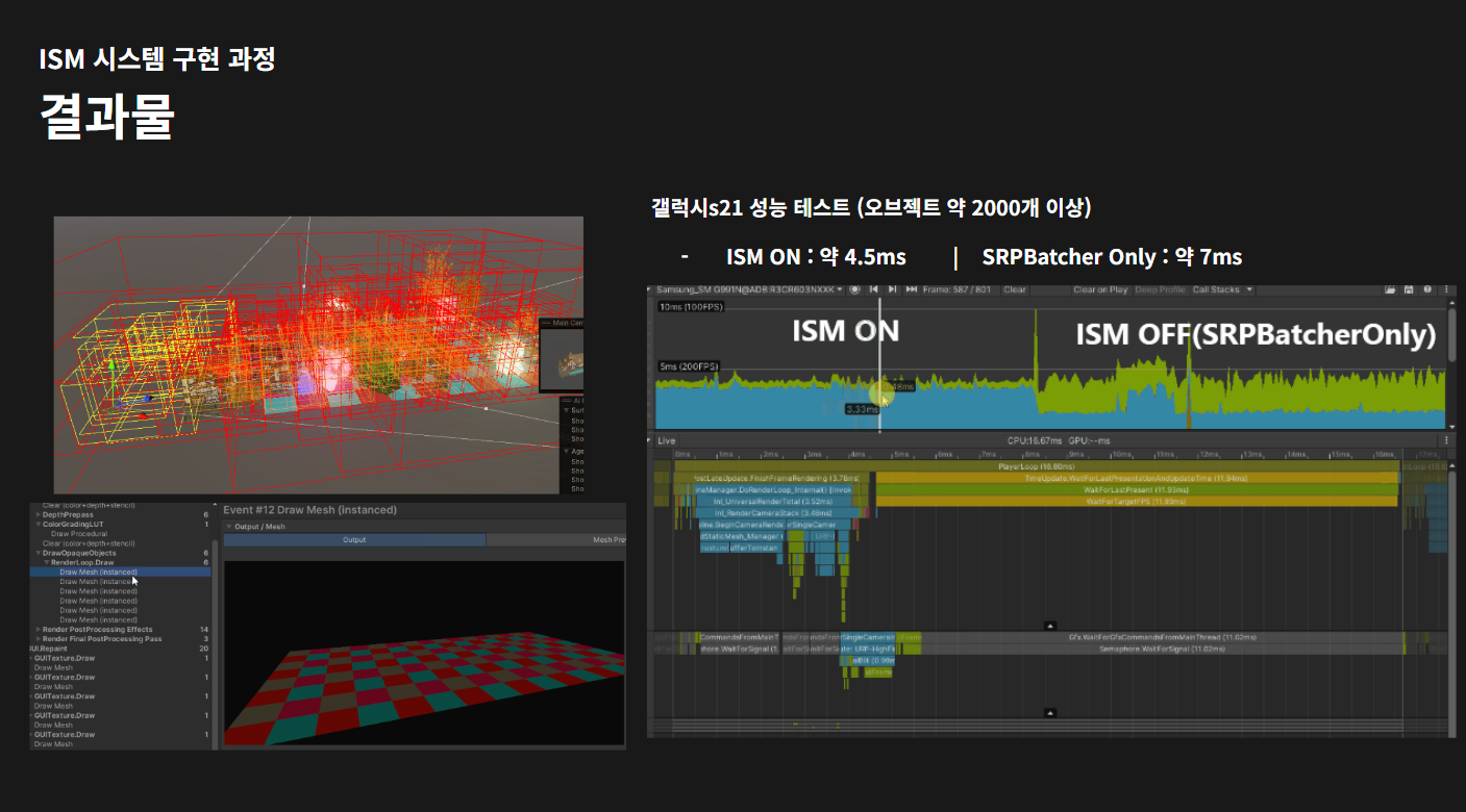 프로젝트에 도입한 ISM 시스템의 다음 발전 방향을 소개합니다. Cluster Mesh Render와 유사한 방식으로 버텍스 인덱스 버퍼로 여러 메쉬를 1 드로우콜로 처리하는 등, 실험적인 기술 구현 내용을 설명합니다.