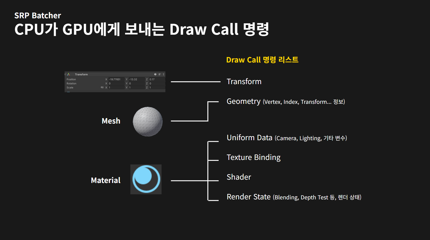 GPU에 렌더 호출을 하기 위해 커맨드버퍼에 담는 정보와 유니티 엔진의 드로우콜 최적화 시스템에서 이를 어떻게 최적화하고 있는지를 설명합니다.