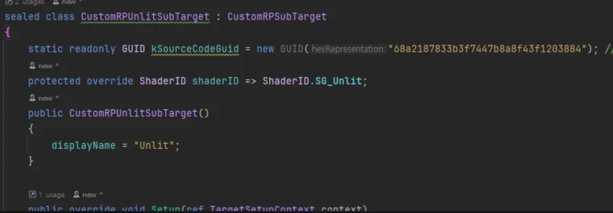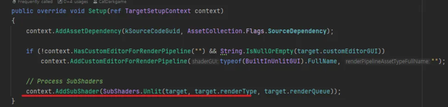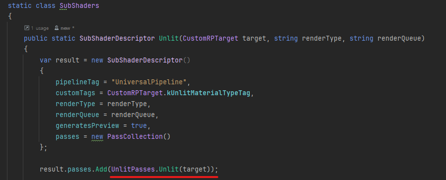 위에서 제작한 Pass 구조체와 동일하게 SubShaders 구조체까지 제작하고 SubTarget 클래스 Setup 함수에서 추가되도록 합니다.
