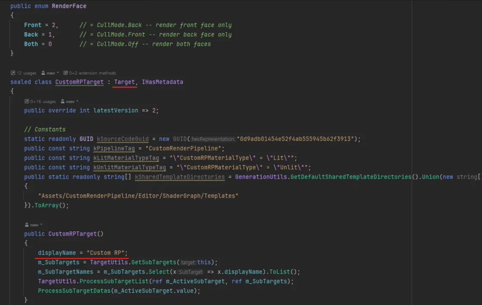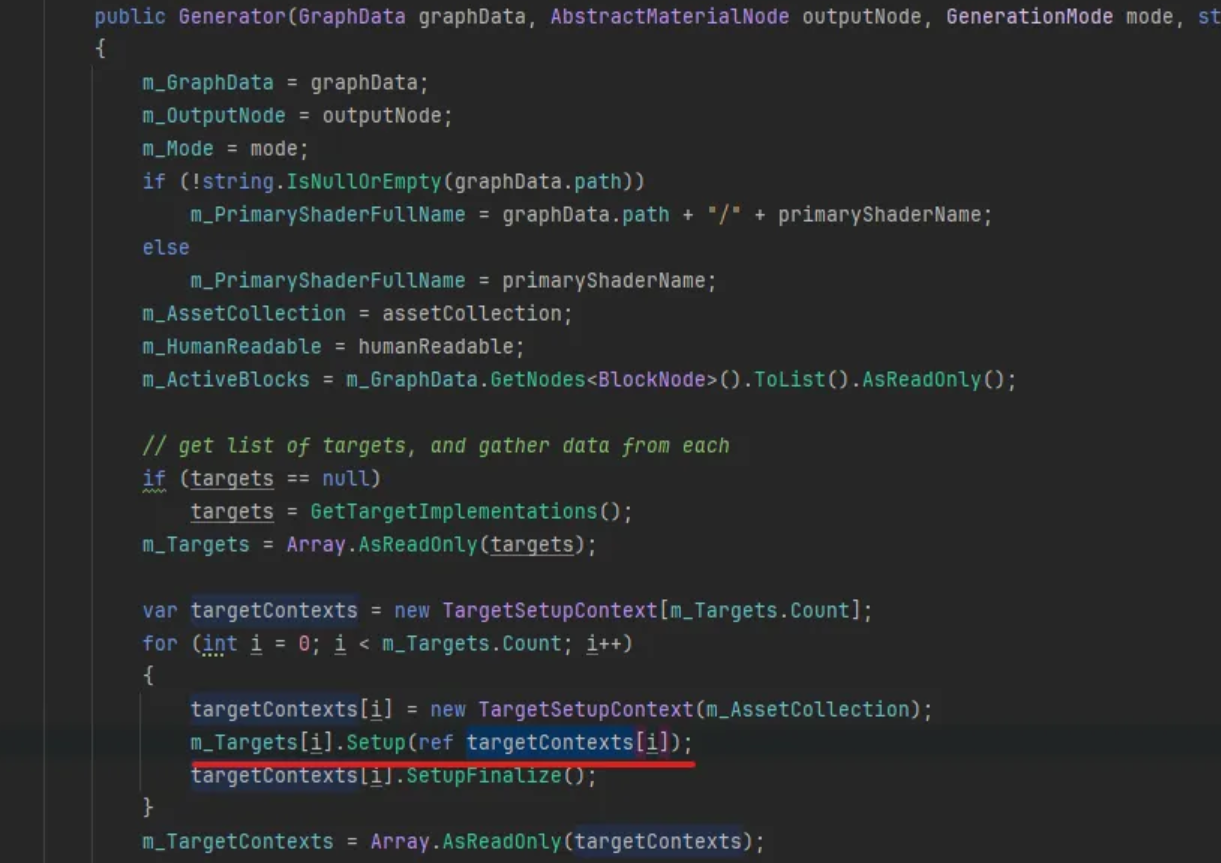 위에서 제작한 커스텀 SubTarget은 ShaderGraph Generator 클래스에서 코드 생성 호출됩니다.