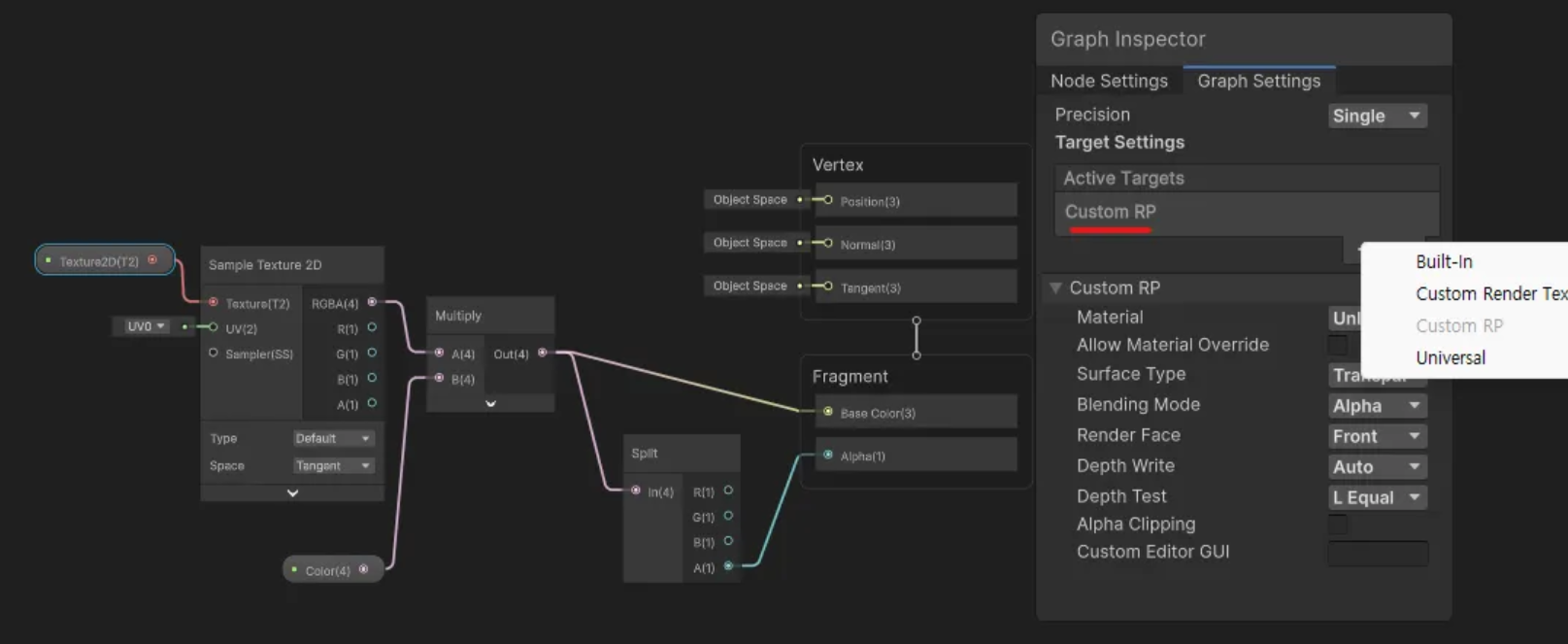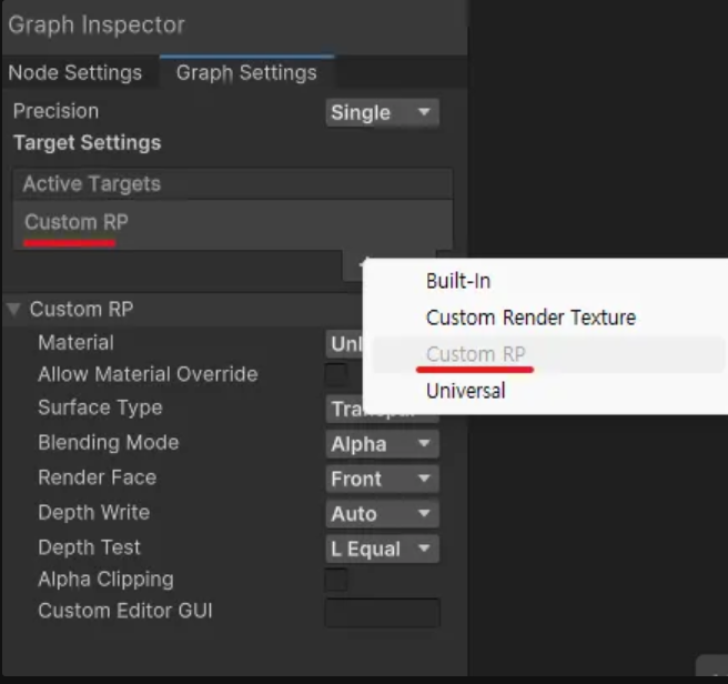 ShaderGraph에 Target 설정 인터페이스가 있습니다, Target RenderPipline을 의미하는 것으로 추측되며 기본적으로 Universal(URP), Built-In, Custom RenderTexture 3가지 존재합니다.