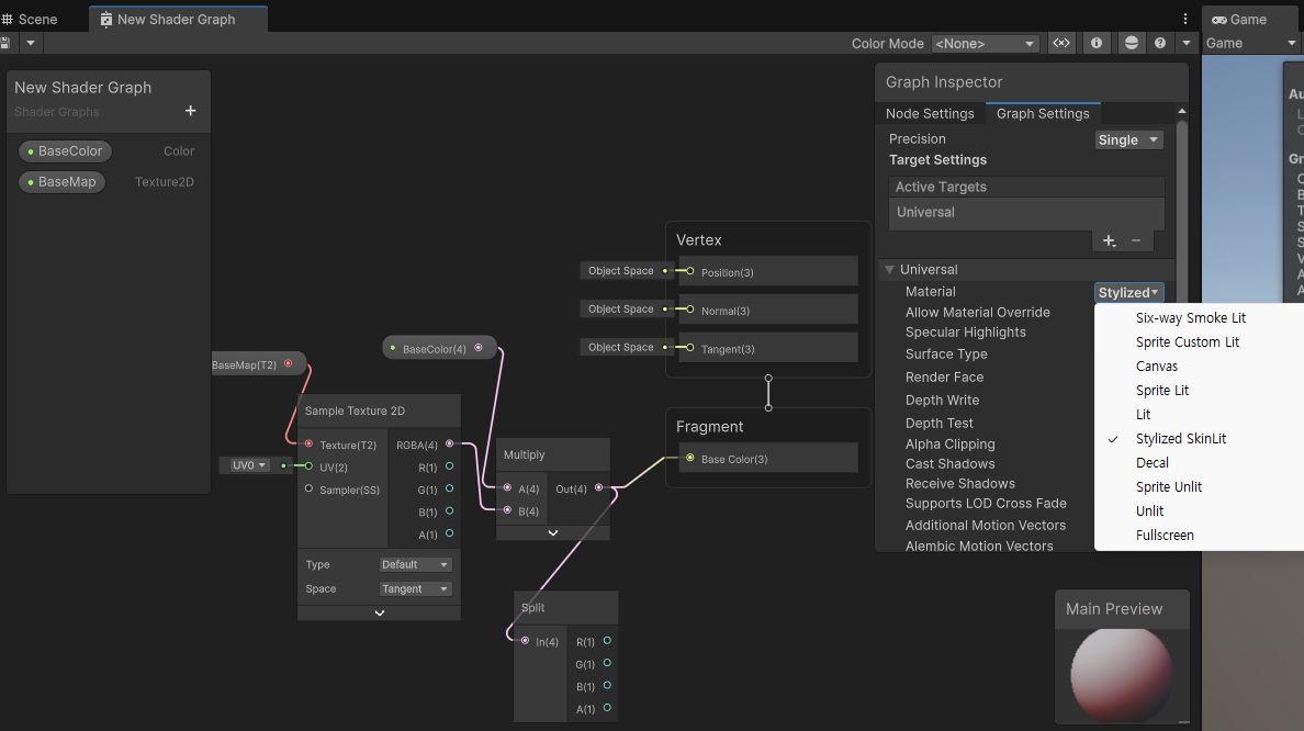SubTarget 커스텀 추가를 통해 Skin, Hair 등 원하는 라이팅 모델을 ShaderGraph에서 사용할 수 있는 것이 가능하지만, Shader 코드 작성이 어렵고 엔진 API가 변동되면 에러 발생할 가능성이 매우 높습니다.