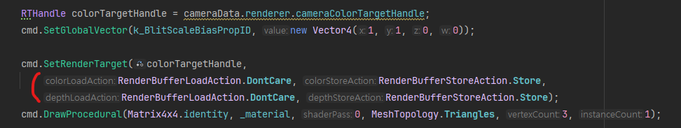 Unity 엔진에서 ScriptableRenderPass 등, 커맨드 버퍼에 RenderTarget 설정 할때 RenderBufferLoadAction & StoreAction 옵션에 대한 설명입니다. 해당 옵션은 SetRenderTarget으로 설정한 렌더버퍼에 대한 데이터를 메모리에 Load 옵션과 Store(방출) 옵션을 설정하는 것입니다.