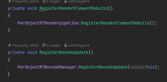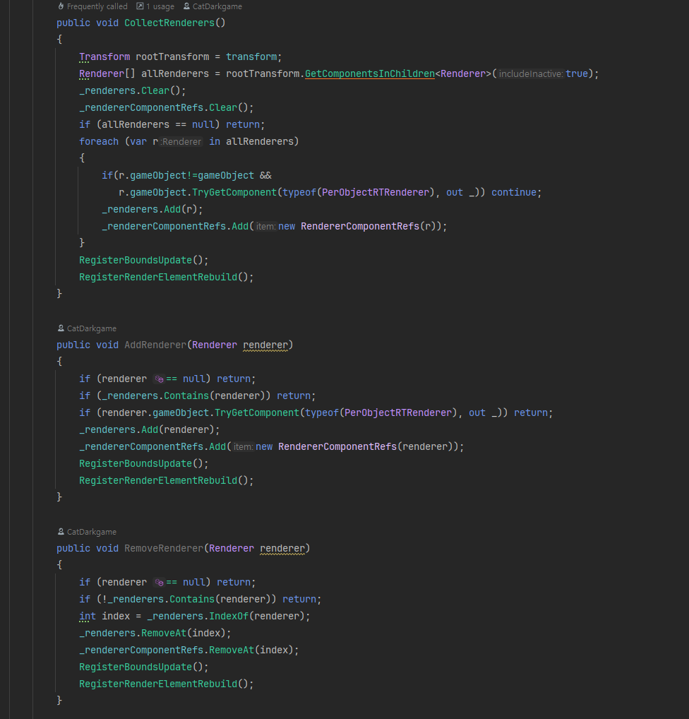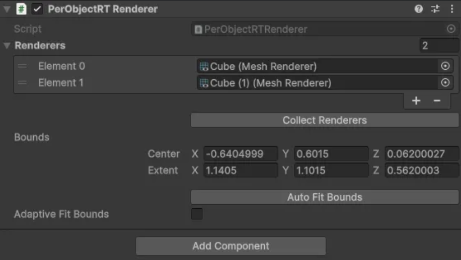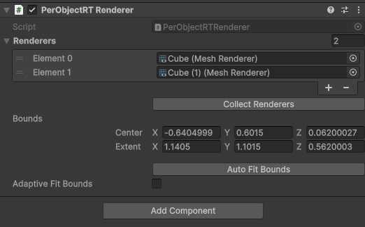 Monobehaviour 객체로 Renderer 및 Bounds, Transform을 수집합니다. 해당 Monobehaviour 컴포넌트가 붙은 오브젝트는 PerObjectRT 렌더 시스템에 렌더링하게 됩니다.