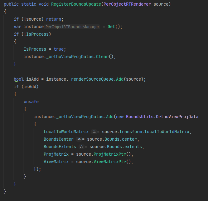 단일 List로 관리하는 이유는, 다수의 PerObjectRT Renderer 객체들의 OrthoViewProjection 행렬 값을 한번에 병렬 계산하기 위함입니다. 병렬 계산은 Job & BurstCompile을 활용했으며 이를 위해 모든 데이터는 Value 타입을 사용하여 Native 자료형을 사용할 수 있도록 합니다.