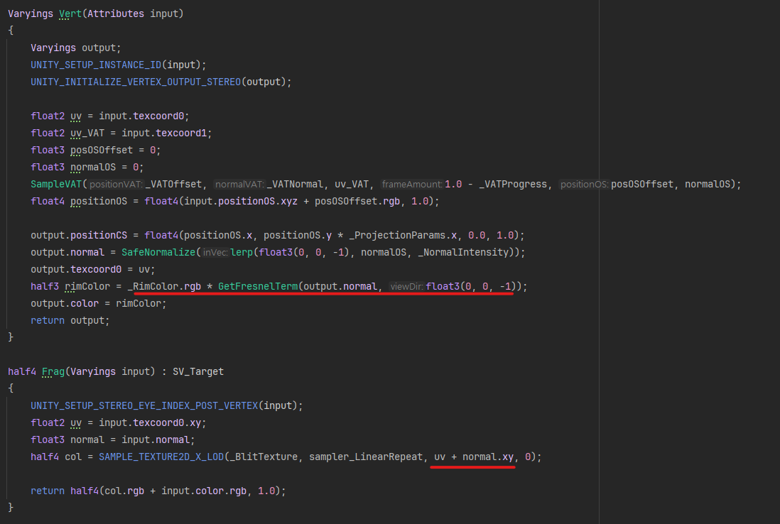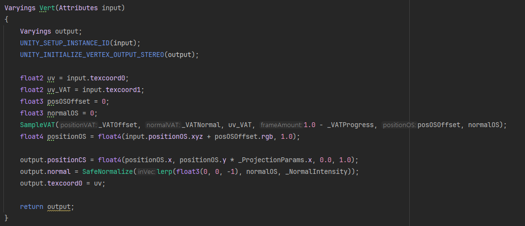 VAT Shader는 이전 Mesh FullScreenShader와 동일하지만, PositionOS에 VAT Position 샘플 데이터를 Offset 처리합니다.