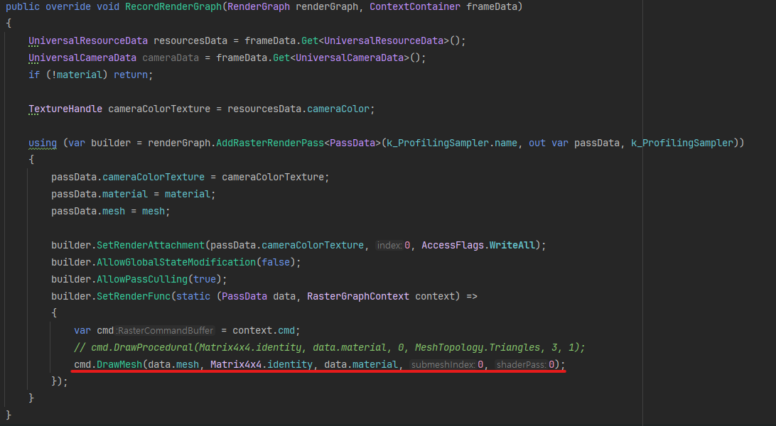 ScriptableRenderPass에서는 이전까지 사용하던 DrawProcedural이 아닌, DrawMesh 함수를 활용해서 원하는 메쉬를 렌더링 할 수 있도록 합니다.