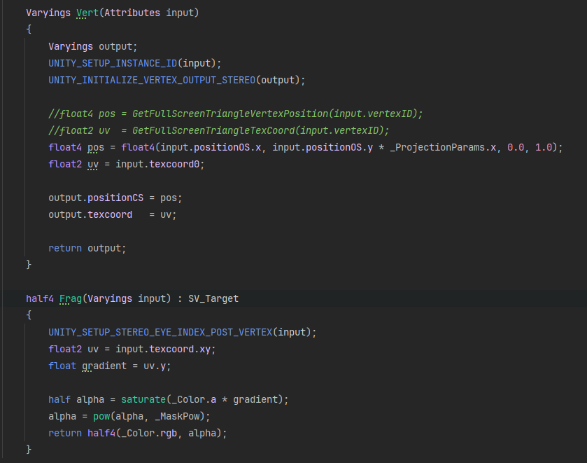 FullScreenShader 설명입니다. Vertex Stage에서는 positionOS 오브젝트 공간 버텍스 좌표를 그대로 positionCS 클립 스페이스로 보냅니다. 이때 Y 값에 _ProjectionParams.x를 곱하는데 이는 OpenGL & DX와 같이 좌표계가 다른 API를 대응하기 위함입니다. UNITY_UV_STARTS_AT_TOP 디파인 조건문을 통해 UV Y를 뒤집는 방법도 있지만, 평면이 아닌 입체감 있는 메쉬까지 대응하기 위해서는 _ProjectionParams를 활용하는 것을 권장합니다.