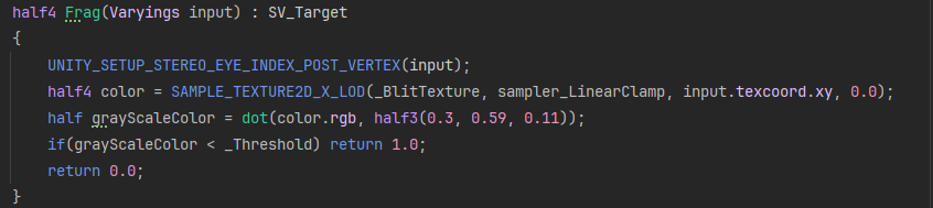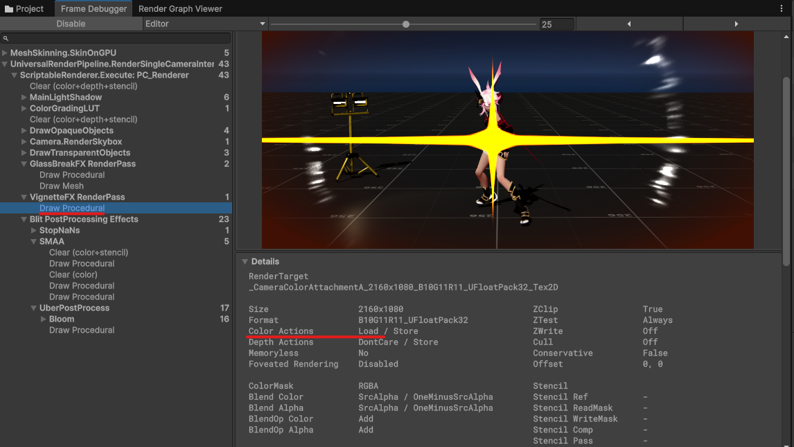 위와 같이 구현 결과, 화면 버퍼 복제 과정 없이 FullScreenShader를 화면에 직접 렌더링하게 되어 1 Pass로 처리 및 추가 렌더텍스처 생성하지 않아 메모리까지 최적화됩니다.