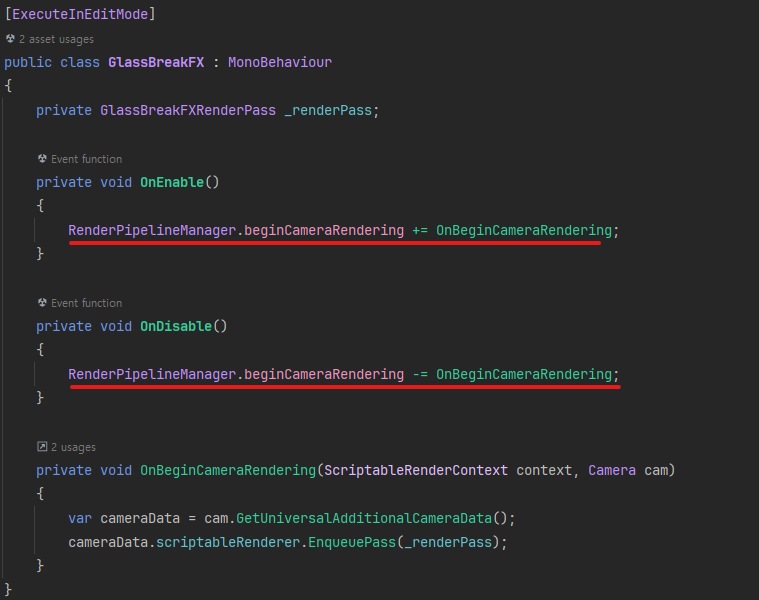RenderPipelineManager.beginCameraRendering += OnBeginCameraRendering;