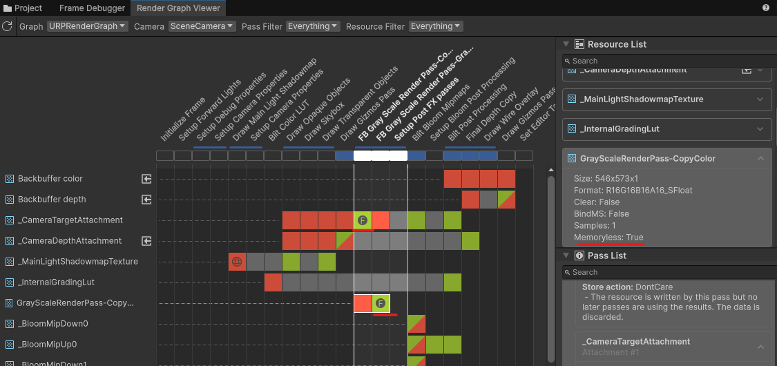 개요Unity6 RenderGraph 호환하기 위한 ScriptableRenderPass 개발 간단 예제입니다.RenderGraph 미지원 & RenderGraph Unsafe & RasterPass + Framebufferfetch 기반으로 간단한 흑백 화면 효과 구현합니다.Unity 6000.1.12f1 버전
