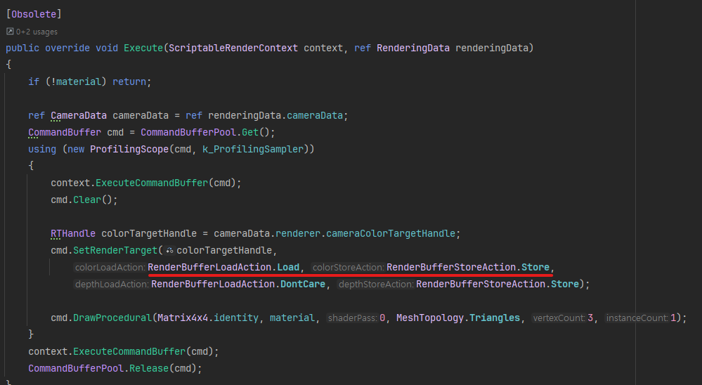 개요Unity 엔진에서 ScriptableRenderPass 등, 커맨드 버퍼에 RenderTarget 설정 할때 RenderBufferLoadAction & StoreAction 옵션에 대한 설명입니다. 해당 옵션은 SetRenderTarget으로 설정한 렌더버퍼에 대한 데이터를