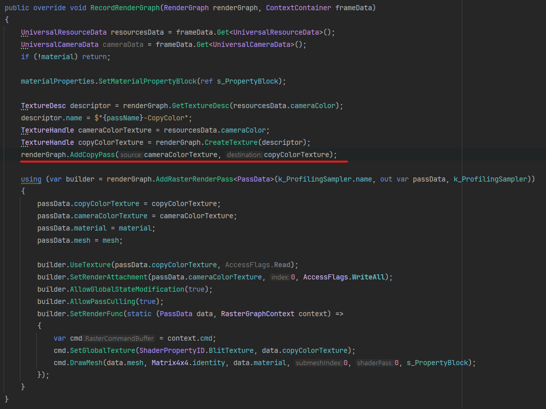 아래 예시에서는 renderGraph.AddCopyPass 함수를 활용했으며, 해당 함수를 사용하면 FrameBufferFetch로 화면 버퍼를 복제할 수 있습니다.