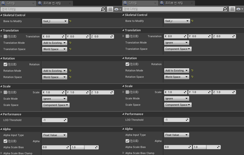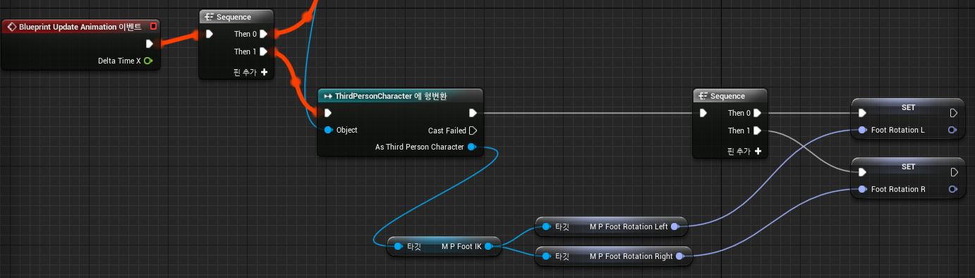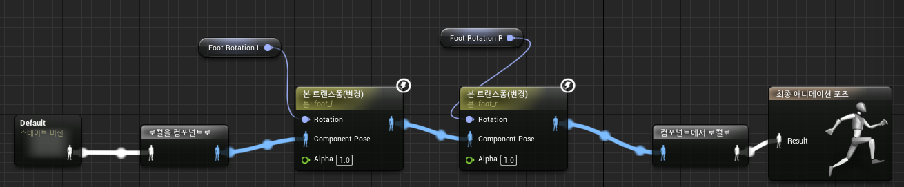 캐릭터의 Animation Blueprint를 열고 이벤트 그래프에서 위 노드 사진과 같이 FootRotatorL,R변수를 만들고