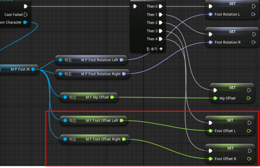 Animation Blueprint에서 이벤트 그래프에서 이전에 값을 Set한거와 마찬가지로 FootOffset L, R 값을 세팅한다.