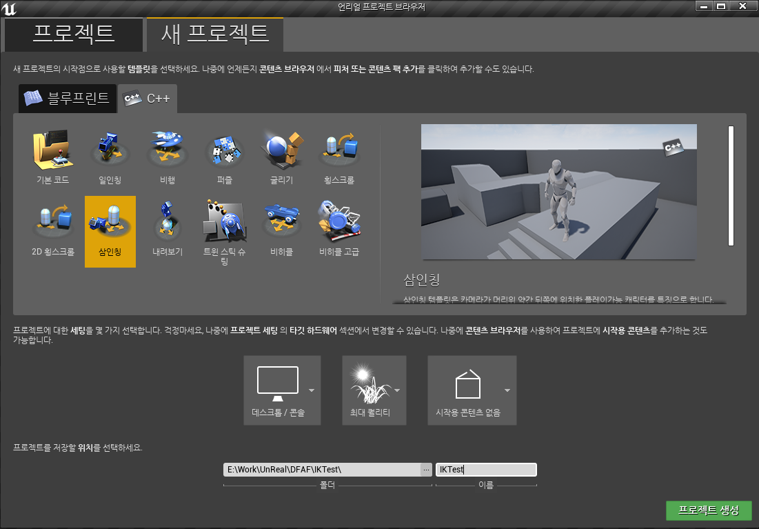 우선 새 프로젝트에 C++ 삼인칭 예제 프로젝트를 생성한다.